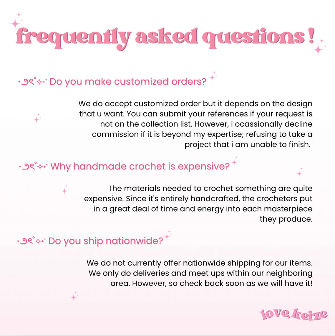i'm kaycee, a bulacan-based small business owner. thanks to my bf, i took up crocheting last year. my passion for crocheting inspired me to open this shop so I could share the lovingly made creations with you.π’Φ΄ΰ»π·ΝΦ